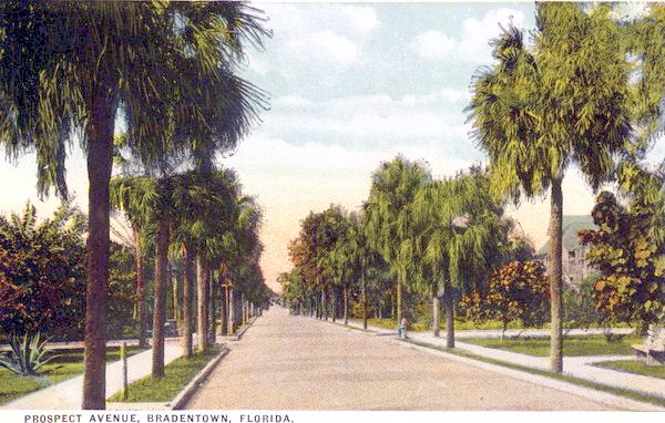 The top photo shows the palm lined drive at Harmony Management's office. The bottom photo is an historical Bradenton, Florida postcard. The scenes look remarkably alike.